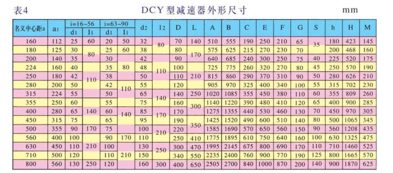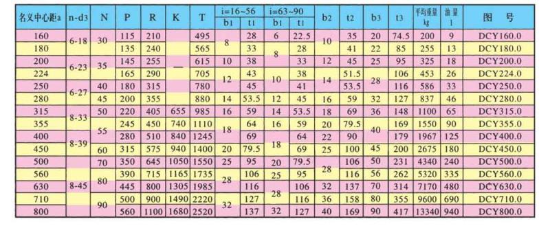 DCY、DCYK、DCZ型減速機(jī)各有15種規(guī)格,名義中心距為:160,180,200,224,250,280,315,355,400,450,500,560,630,710,800mm;每種規(guī)格均有11種傳動(dòng)比(16,18,20,22.4,25,28,31.5,35.5,40,45,50)兩種旋向,四種裝配型式,分別組成660種減速機(jī)。